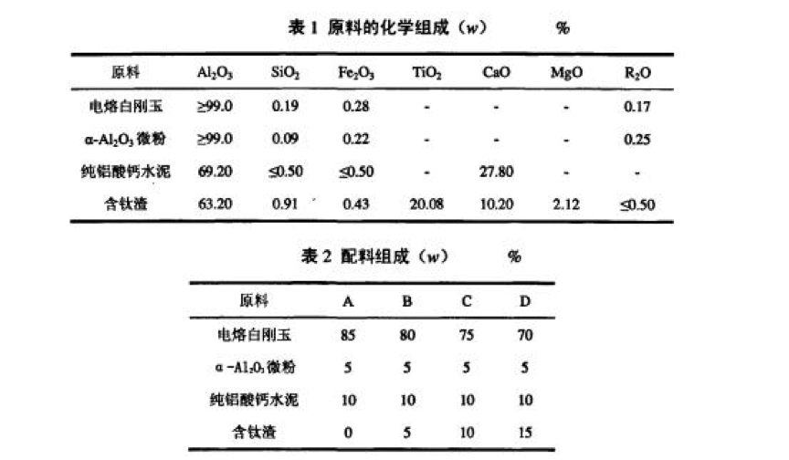 試驗用主要原料為電熔白剛玉、活性葉舢203微粉、純鋁酸鈣水泥、含二氧化鈦工業(yè)渣以及AC.H.Z200 等有機添加劑,其化學組成如表l所示。
