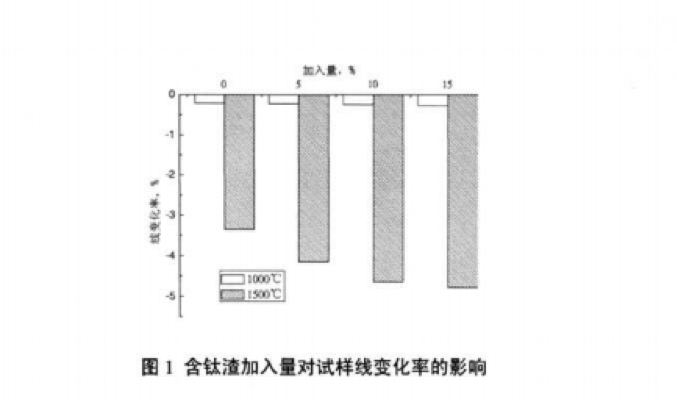 圖1所示為含鈦渣的/JnA.量對試樣熱處理后線變化率的影響。由圖l可以看出,隨著含鈦渣加入量的 增加,經(jīng)1000*Cx3 h熱處理后的試樣的線變化率相差不大,都存在0.2%左右的收縮。但經(jīng)1500"Cx3 h 熱處理后的試樣的線變化率則相差較大,隨著含鈦渣加入量的增加而收縮增大,主要是因為含鈦渣的加 入促進了材料的燒結,加入量愈大收縮愈大。但含鈦渣的加入量由10%增加到15%后,試樣的線變化率 變化趨緩,可能由于鈦酸鋁的大量形成,其膨脹抵消了部分的燒結收縮。
