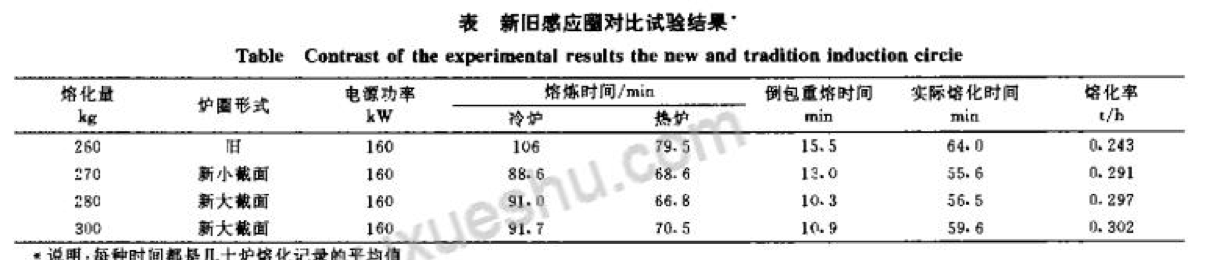 經過更換中頻電爐感應圈,改接電容器,完成了電爐的改造。在清華大學機械廠沙河分廠進行了新舊爐型的對比試驗。熔化材料為玲激合金鑄鐵,鐵水溫度1480℃。試驗結果見下表。